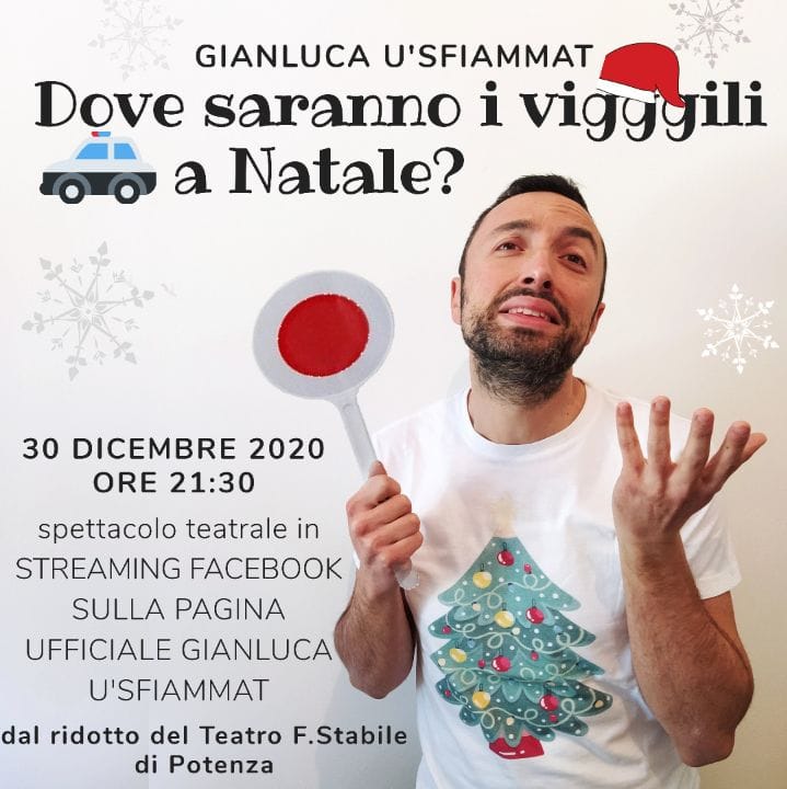 Un’occasione per sentirsi vicini, anche se a distanza, e per dare allegria soprattutto a chi non è riuscito a tornare nel proprio paese d’origine per le festività natalizie, è questo l’intento dello spettacolo teatrale di Gianluca u’Sfiammat. L’appuntamento è per oggi mercoledì 30 dicembre alle ore 21.30 in diretta streaming sulla pagina facebook del comico lucano.