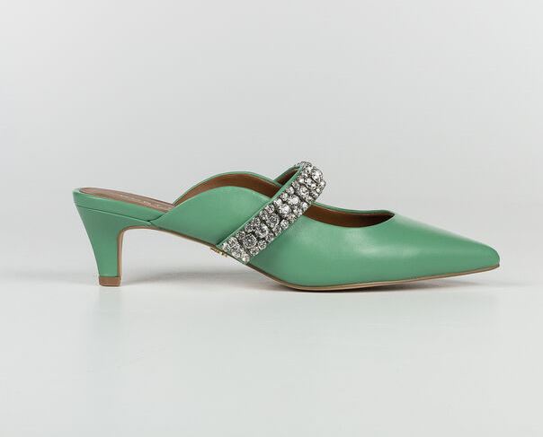 Il salotto dai colori infiniti ti consiglia il modello di sabot kitten heel di Kurt Geiger chiamato Dutchess. Il sabot è tipicamente una calzatura da indossare in estate perché lascia il tallone scoperto. Questo modello si presenta in pelle, di colore verde salvia, con punta affusolata e strass che ricoprono il listino (la fascia che unisce i due lati della scarpa e serve a fermare il piede).
