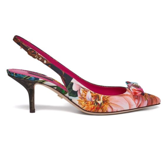 Tra le tante varianti create dai designer, ecco la colorata proposta di décolleté slingback Dolce&Gabbana. Stampe floreali sui toni di un rosa pastello giocano con dettagli importanti che arricchiscono la parte sulla punta della scarpa. Cinturino regolabile e tacco midi nero rendono questa calzatura ideale per serate raffinate e passeggiate a piedi al chiaro di luna. Da indossare con ampie gonne retrò di colore bianco o nero.