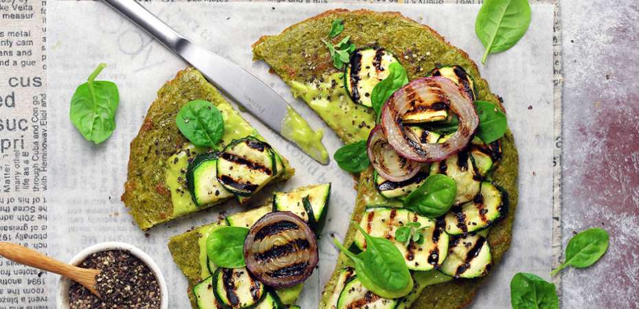 - Nel frattempo, griglia alcune verdure. Puoi servire questa focaccia verde di ceci con guacamole, zucchine e cipollotti grigliati, mantenendo così un piatto vegan senza glutine.