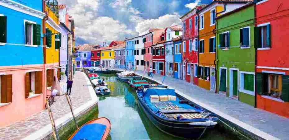 Burano è il borgo colorato per antonomasia. Le sue case sono famose in tutto il mondo per i colori brillanti e si affacciano sui canali regalando un panorama unico.